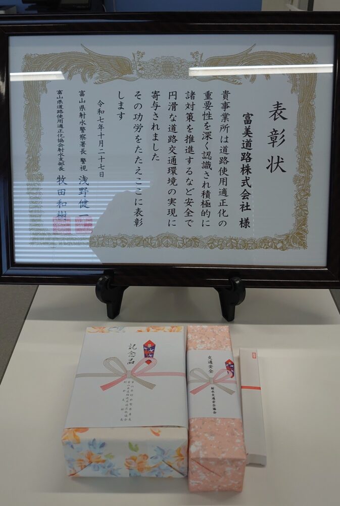 富山県道路使用適正化協会様より弊社が道路使用の適正化に寄与したとして、表彰状を頂きました
